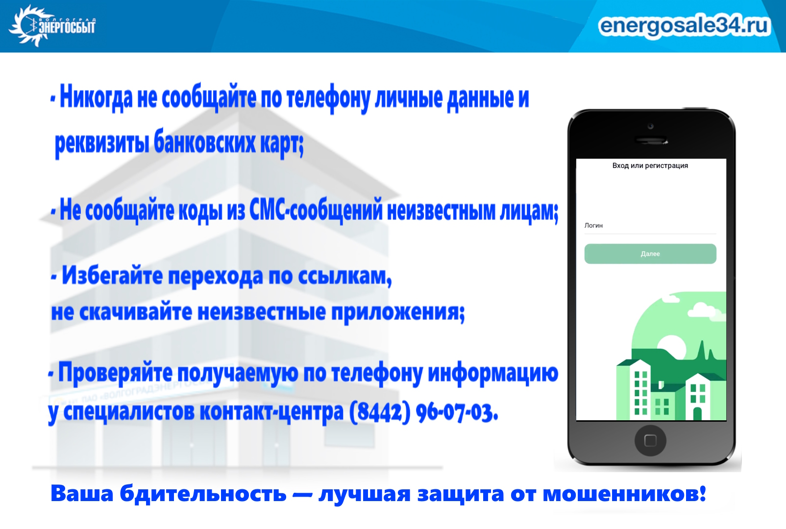 • Для передачи показаний, оплаты и других функций удаленных сервисов ПАО «Волгоградэнергосбыт» используется мобильное приложение компании, которое можно скачать самостоятельно из официальных магазинов мобильных приложений, а не по указаниям звонящих незнакомцев.